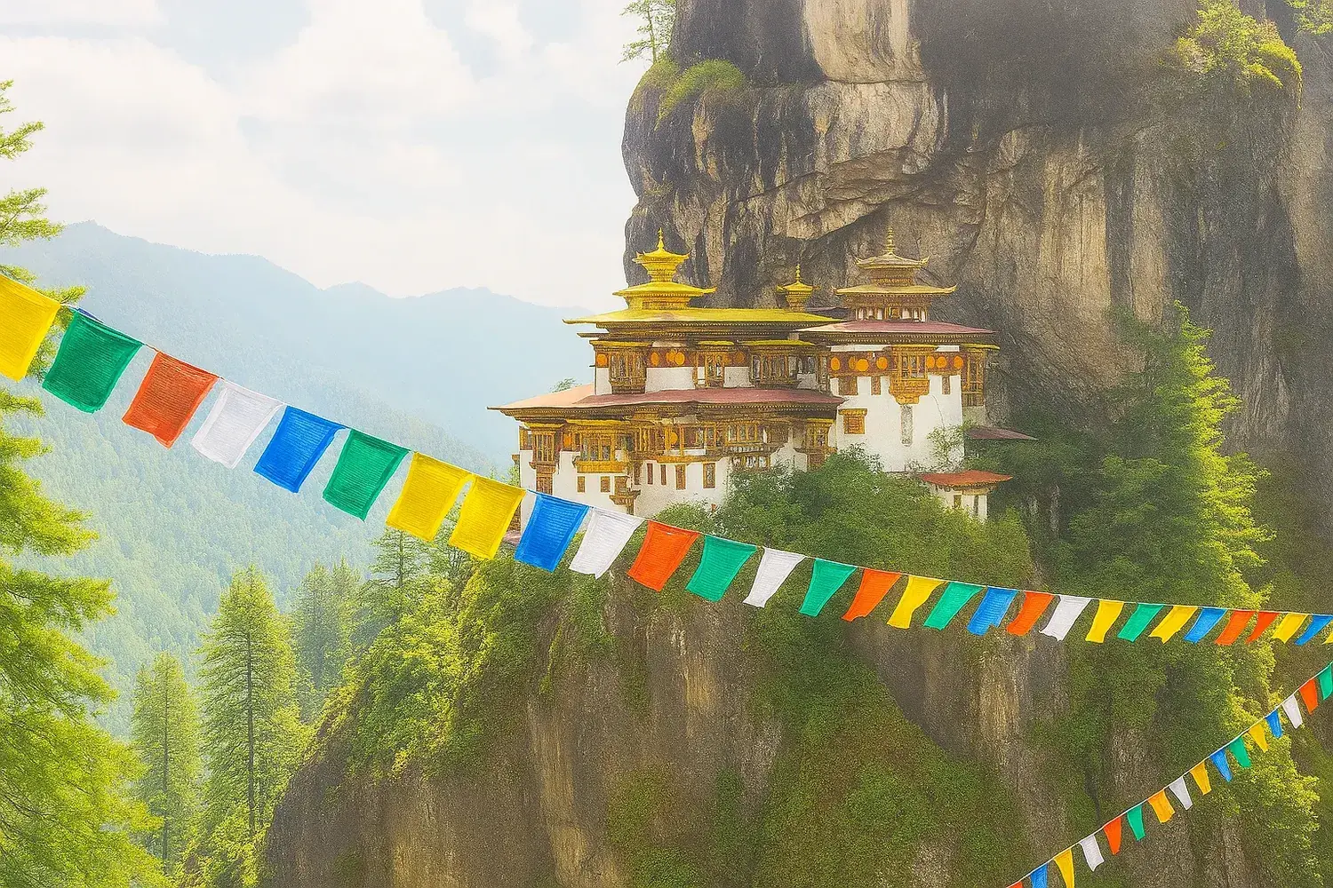 – Taktsang Lhakhang (Nido del Tigre) es un monasterio situado en un acantilado a una altitud de más de 3000 metros, un símbolo de espiritualidad y felicidad.
